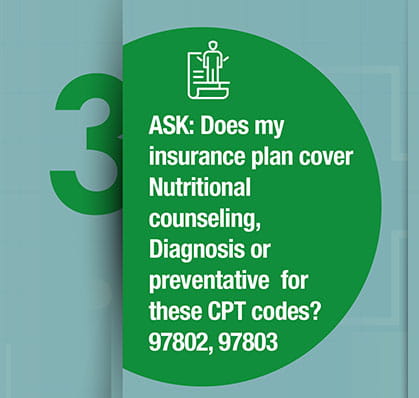 Ask, “Does my plan cover nutritional counseling, diagnosis, or preventative for these CPT codes: 97802, 97803?” “Do I need a referral, prior authorization, or get a pre-determination letter before my appointment?” Get answers to get ready for your appointment!